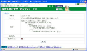 福井県警犯罪位置情報システムでは、「地域安全・安心マップ」に用意されている3種類の表現方法を、声掛け事案等には絶対サイズによるアイコン表示、交通事故には相対サイズによるアイコン、8種類の犯罪にはメッシュによる主題図による表示とし、情報公開とプライバシー保護を両立させました。