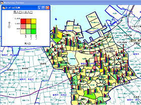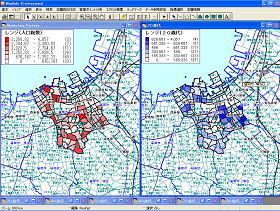 Marketing Partner(マーケティング・パートナー)は、判り易い色塗り地図を左右に並べて関連性を検討する機能があります(これを「2レンジマップ」と呼んでいます)。